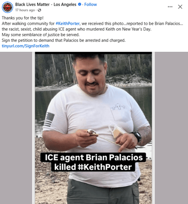 After walking community for #KeithPorter, we received this photo…reported to be Brian Palacios…the racist, sexist, child abusing ICE agent who murdered Keith on New Year’s Day.